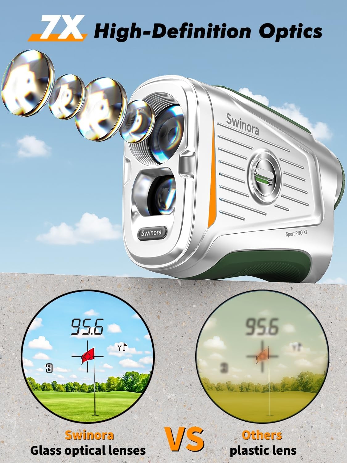 - 1300y accuracy + 7x zoom: this golf rangefinder with slope delivers +/-0.3 yard precision from 3 to 1300 yards. the anti-glare 7x lens and ultra-clear lcd display provide sharp visuals even in bright daylight. built-in slope switch makes it tournament legal, while still offering true slope compensation when enabled.