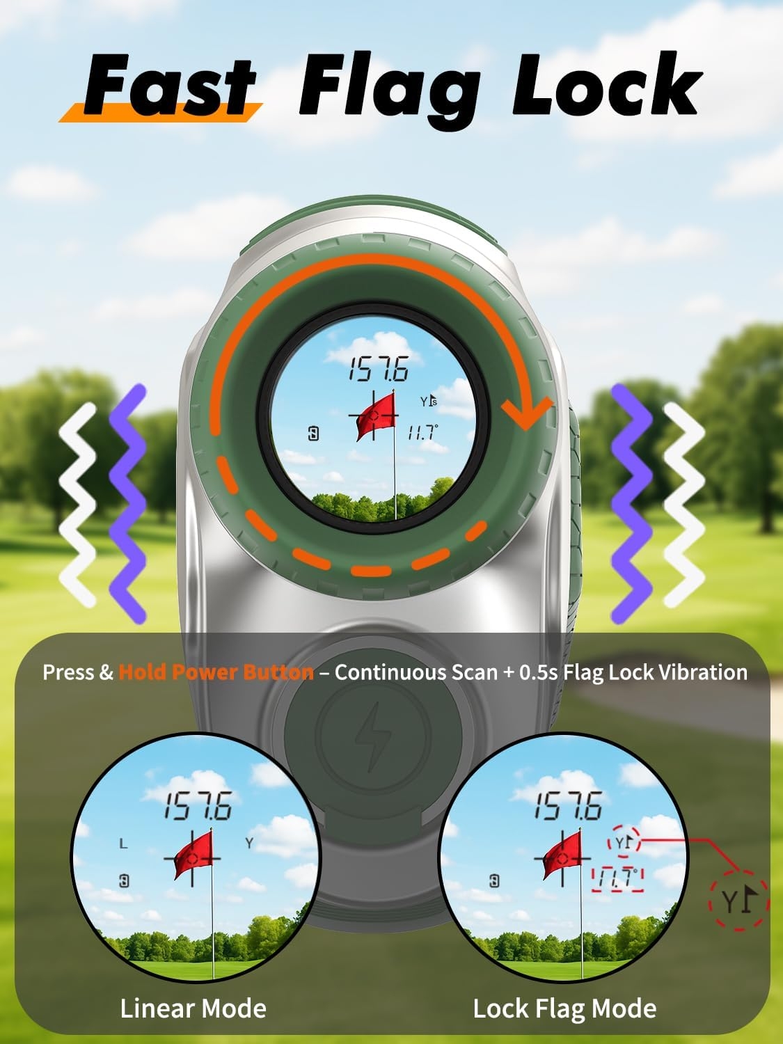 - Flag lock mode: built for competitive golf, flag lock ensures reliable pin targeting within 250y. long-press for a stable scan that locks the flag in 0.5s with vibration feedback. long-press minimizes hand-shake error, while single-click favors speed over stability.