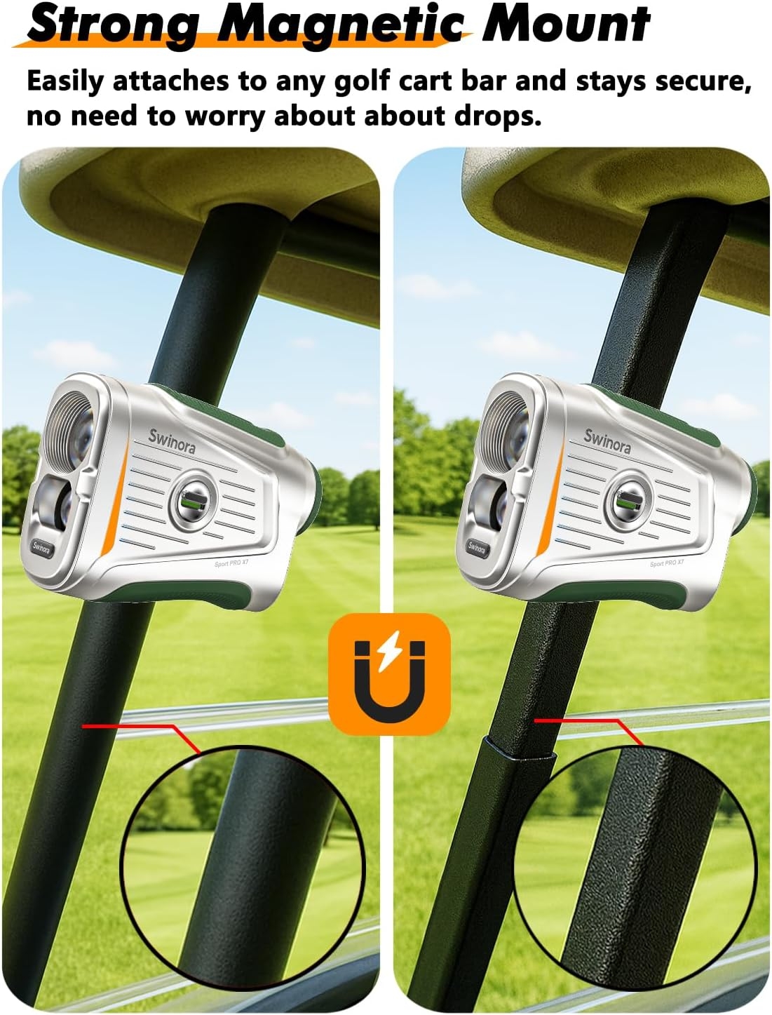 - Upgraded magnet mount: a reinforced magnetic strip securely attaches the rangefinder to your cart or clubs—even on bumpy paths. grab it with one hand, shoot, and reattach instantly. no straps, no clips, no hassle—just fast access every time.