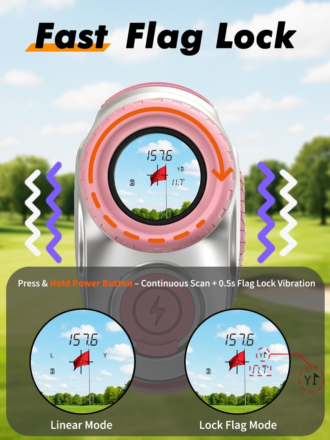 - Flag lock mode: built for competitive golf, flag lock ensures reliable pin targeting within 250y. long-press for a stable scan that locks the flag in 0.5s with vibration feedback. long-press minimizes hand-shake error, while single-click favors speed over stability.