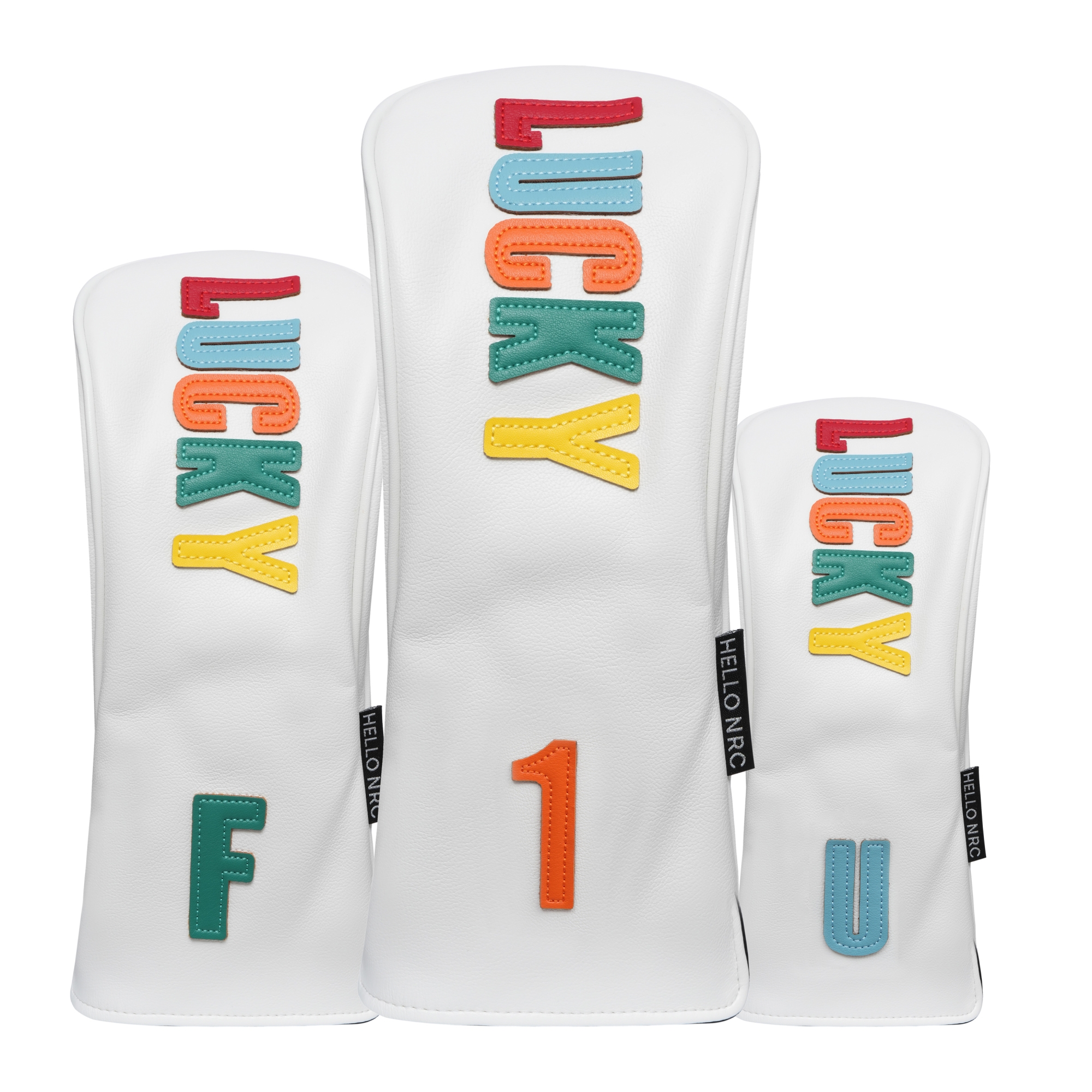 Lucky design style: showcases a clean white design with a stylish “lucky” lettering motif, adding a touch of charm and positivity to your golf bag while elevating your course style.
